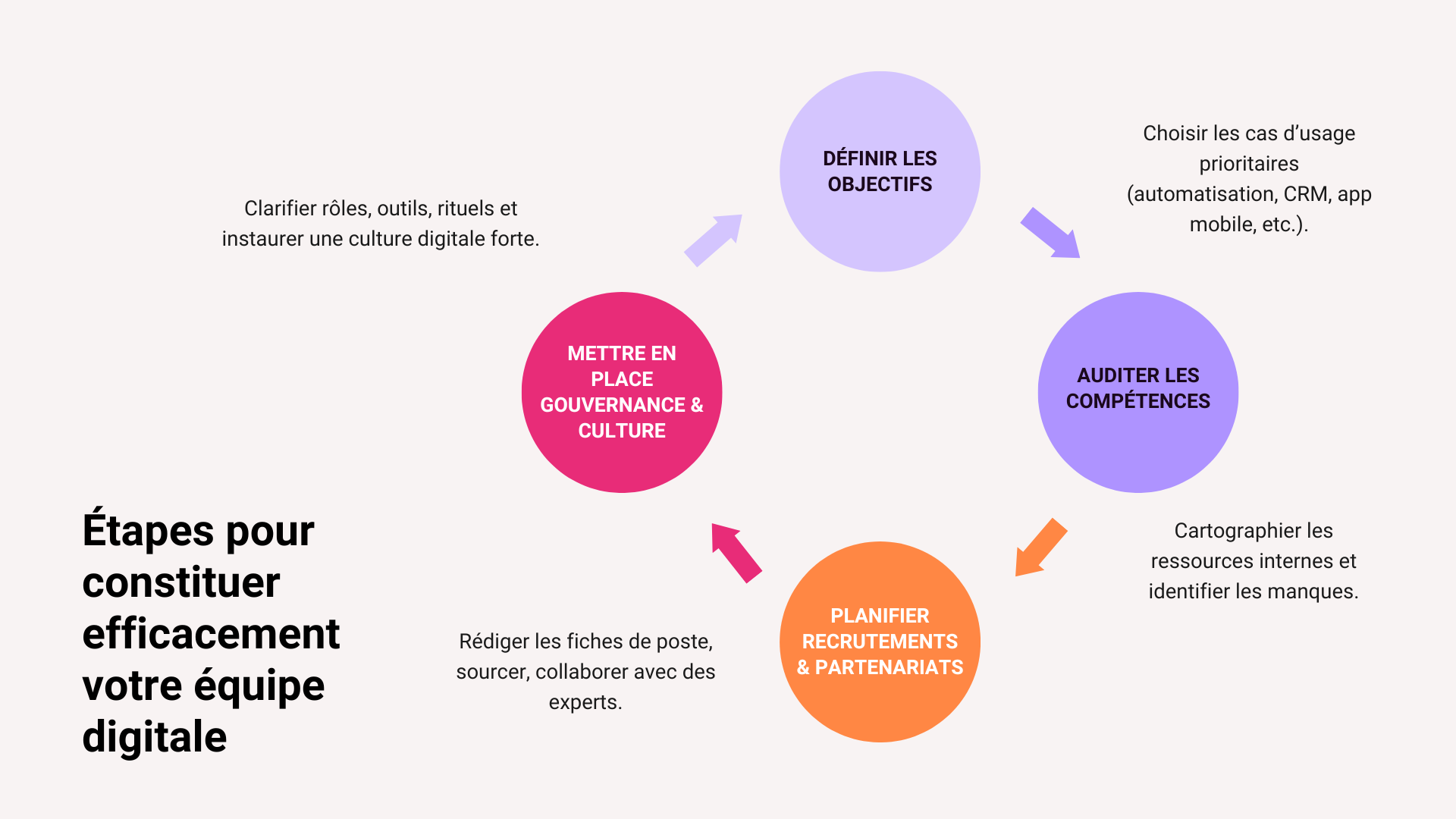 Monter une équipe digitale performante ne se résume pas à additionner des profils. C’est un processus structuré qui doit s’appuyer sur une vision claire et des choix adaptés aux besoins de l’entreprise. Voici les étapes clés :
